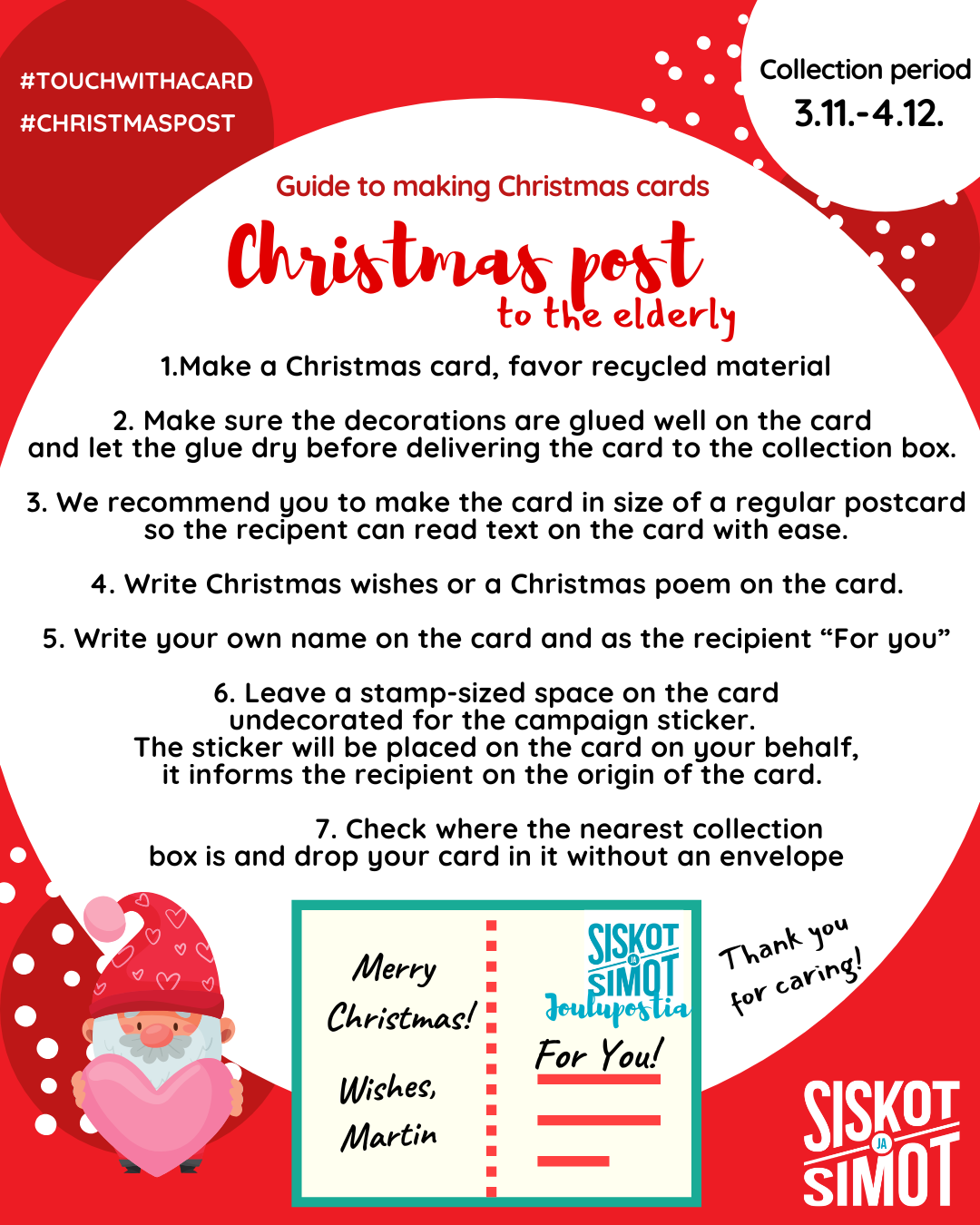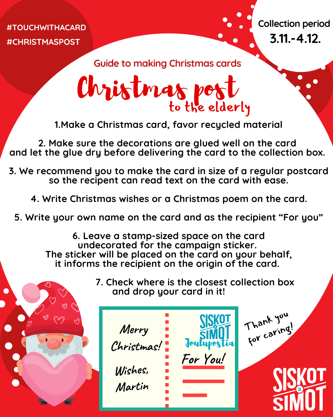 For example: Merry Christmas!/Hyvää Joulua From Siskot ja Simot and me (your name). - Bring the card as it is to your nearest collection box. Please do not put the card in a sealed envelope when you are taking your cards directly to the collection box.