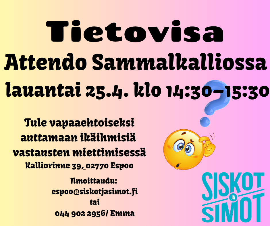 ![]() | ESPOO: Tietovisa MILLOIN: 25.4.2026 14:30 – 15:30 Lue lisää ja ilmoittaudu |