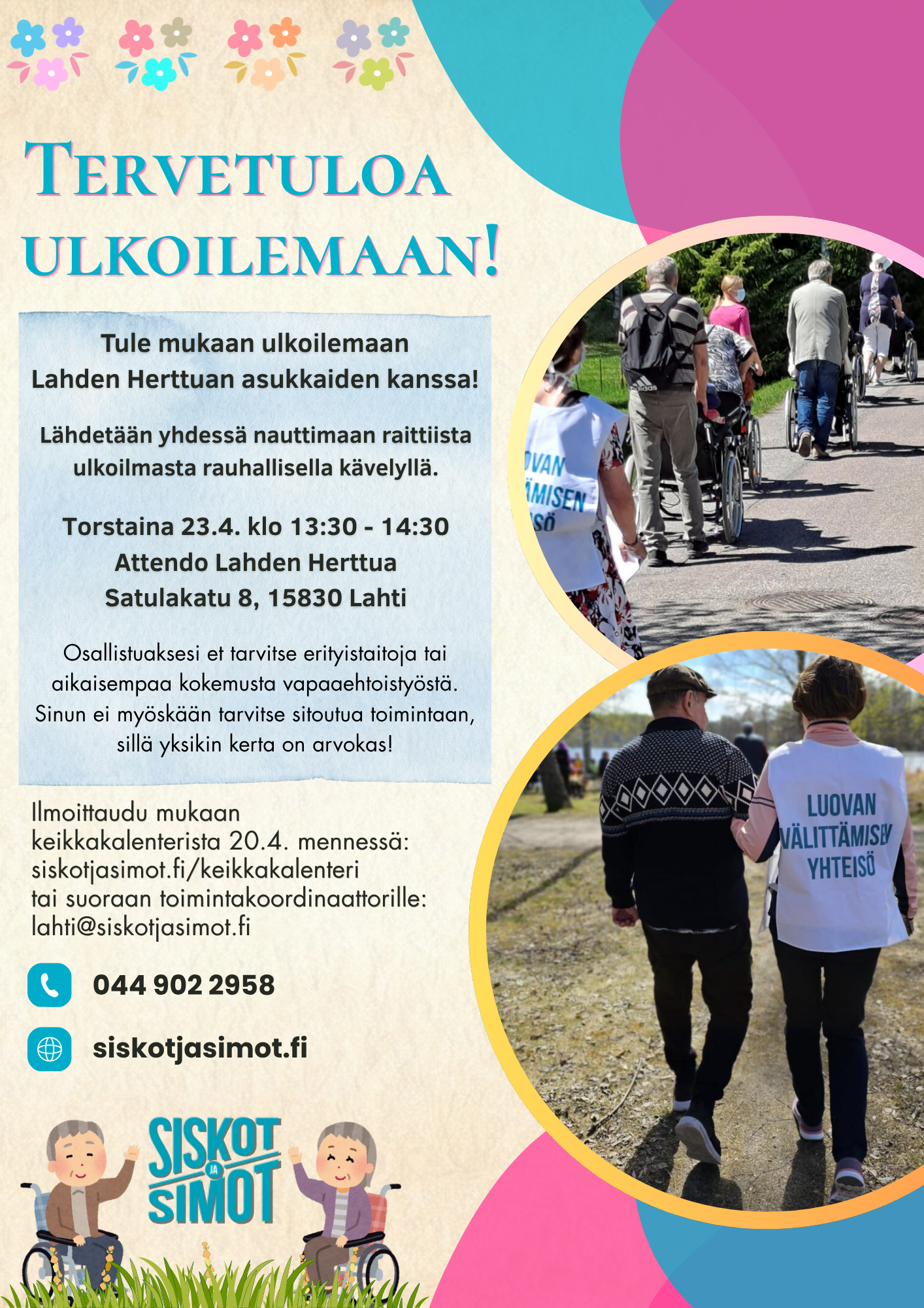 ![]() | LAHTI: Ulkoilua, Attendo Lahden Herttua MILLOIN: 23.4.2026 13:30 – 14:30 Lue lisää ja ilmoittaudu |