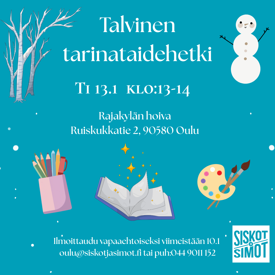 ![]() | OULU: Talvinen tarinataidehetki MILLOIN: 13.1.2026 13:00 – 14:00 Lue lisää ja ilmoittaudu |