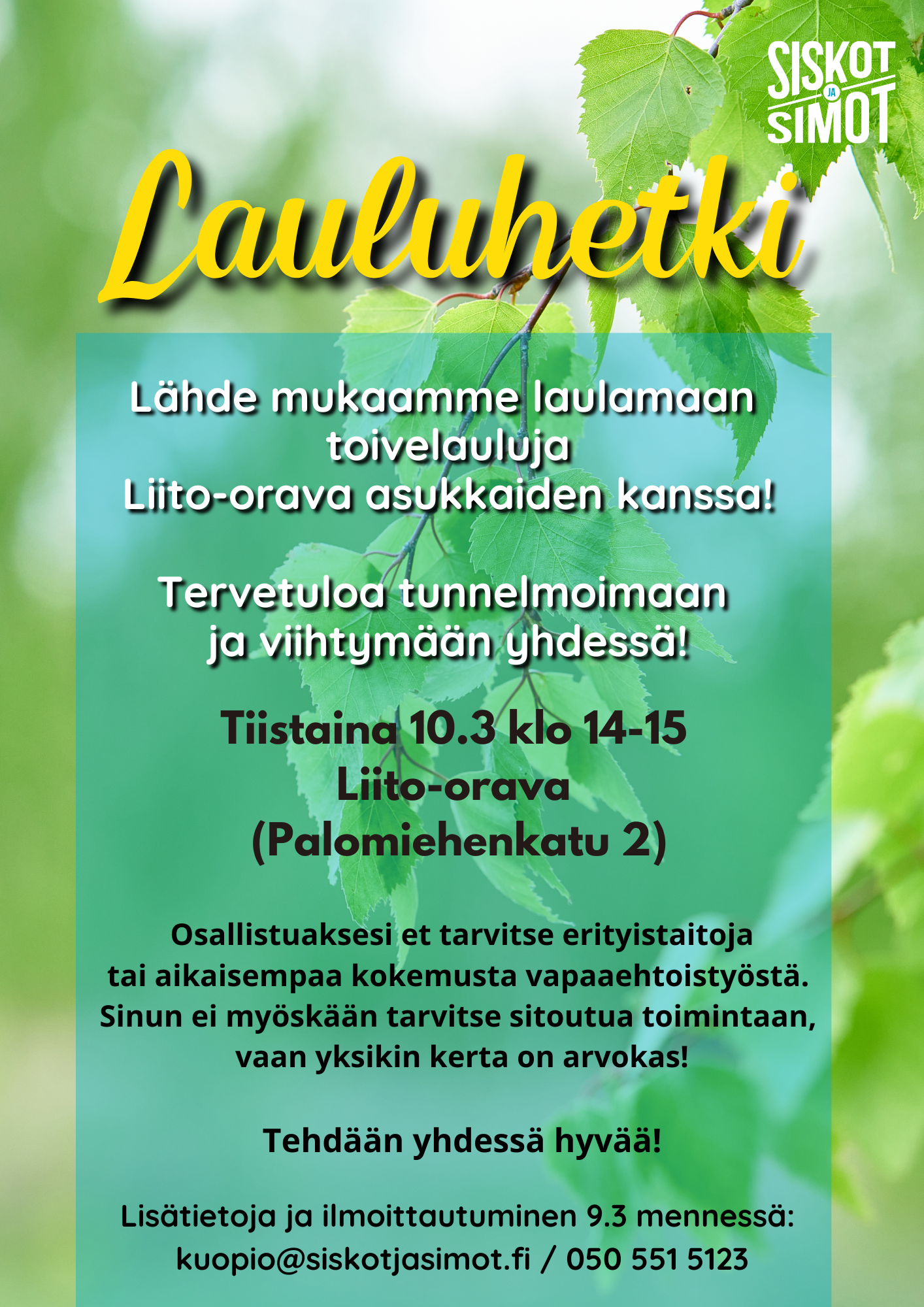 Lähde mukaan Laulelemaan yhdessä tuttuja lauluja ja nauttimaan hyvästä seurasta Hoitokoti Liito-Oravan asukkaiden kanssa. Kaikki innokkaat laulajat ja seuranpitäjät otetaan lämmöllä vastaan. Piristetään yhdessä Liito-Oravan asukkaiden päivää!