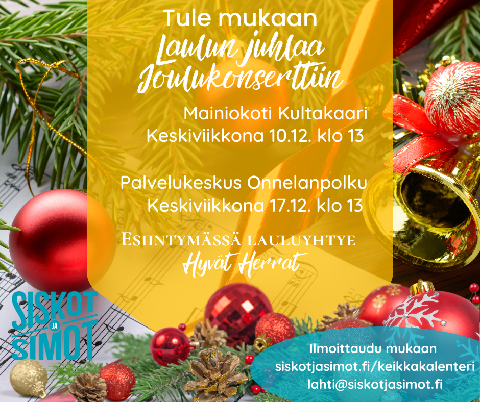 MITÄ: Joulun juhlaa Joulukonsertti. Lauluyhtye Hyvät Herrat esiintyy.