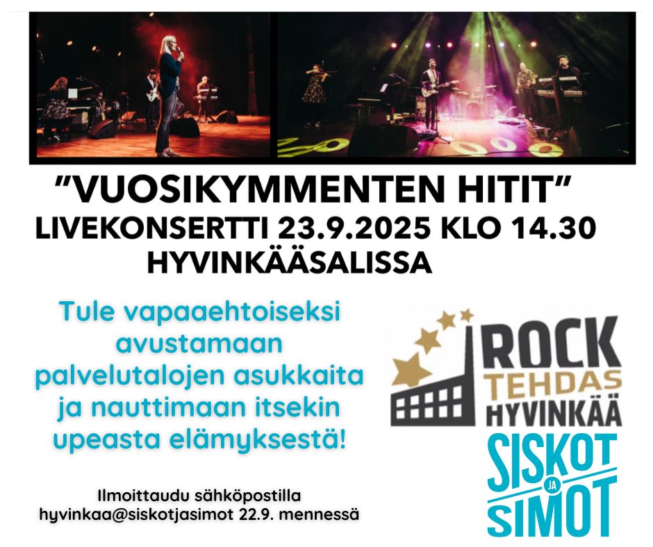 Roctehdas tarjoaa upean musiikkielämyksen palvelutalojen asukkaille ja heidän avustajilleen. Tule vapaaehtoiseksi avustamaan palvelutalojen asukkaita ja nauttiman itsekin upeasta elämyksestä!